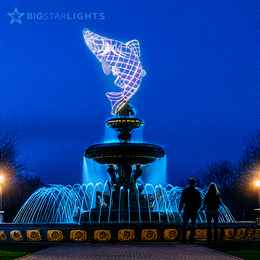 Fish are a great addition near rivers and ponds, especially when carefully placed above them. Consult your electrician for running power through water. This fish sculpture can be made in any color and be designed in varying poses. They are typically designed to sit on posts. Gold frames with warm-white lights are the most commonly requested color, however any color is available upon request.