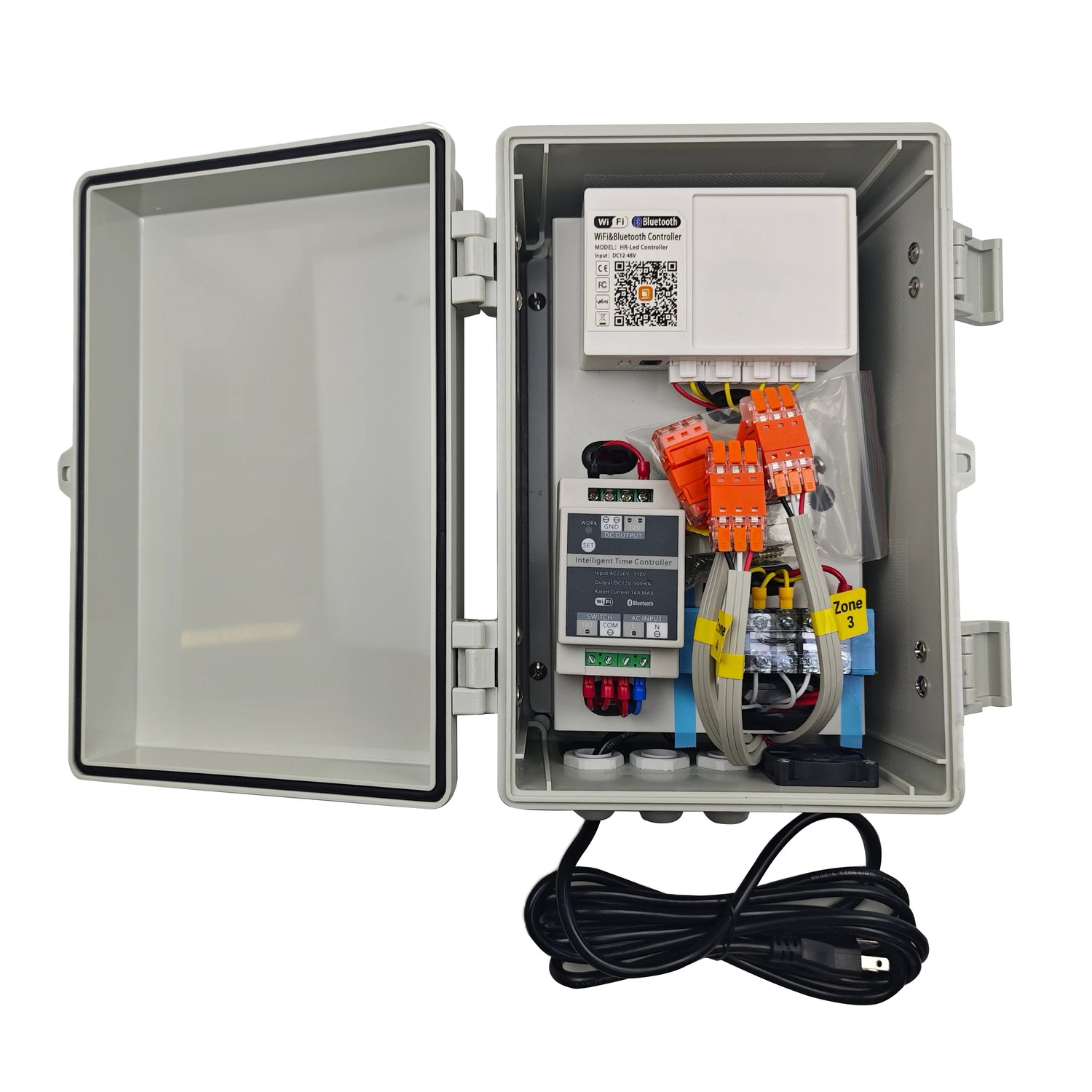 The Chromaglow Pro 4 Zone Controller Box with Power Supply is designed for flexible and reliable lighting control. Choose from a control box with one controller and one 600W power supply for up to 300 feet of lights, or a control box with one controller and two 600W power supplies for up to 600 feet. You can connect to the controller with iOS or Android devices using WiFi or Bluetooth, and both the app and the included external timer let you schedule your lights. Each controller manages up to 1,500 feet of lights. For larger displays, simply add more power supplies with a Power T connector—multiple controllers can sync together. The outdoor system comes packaged in a watertight enclosure with mounting brackets for fully exposed installations. Download the app via the: Apple Store Android