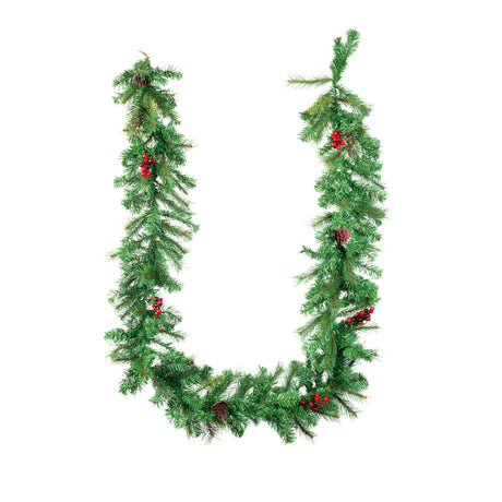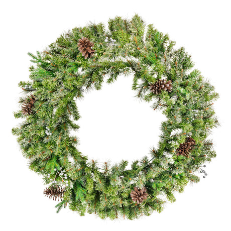 Warm white LED pre-lit. Realistic greenery, berries, and pine cone.