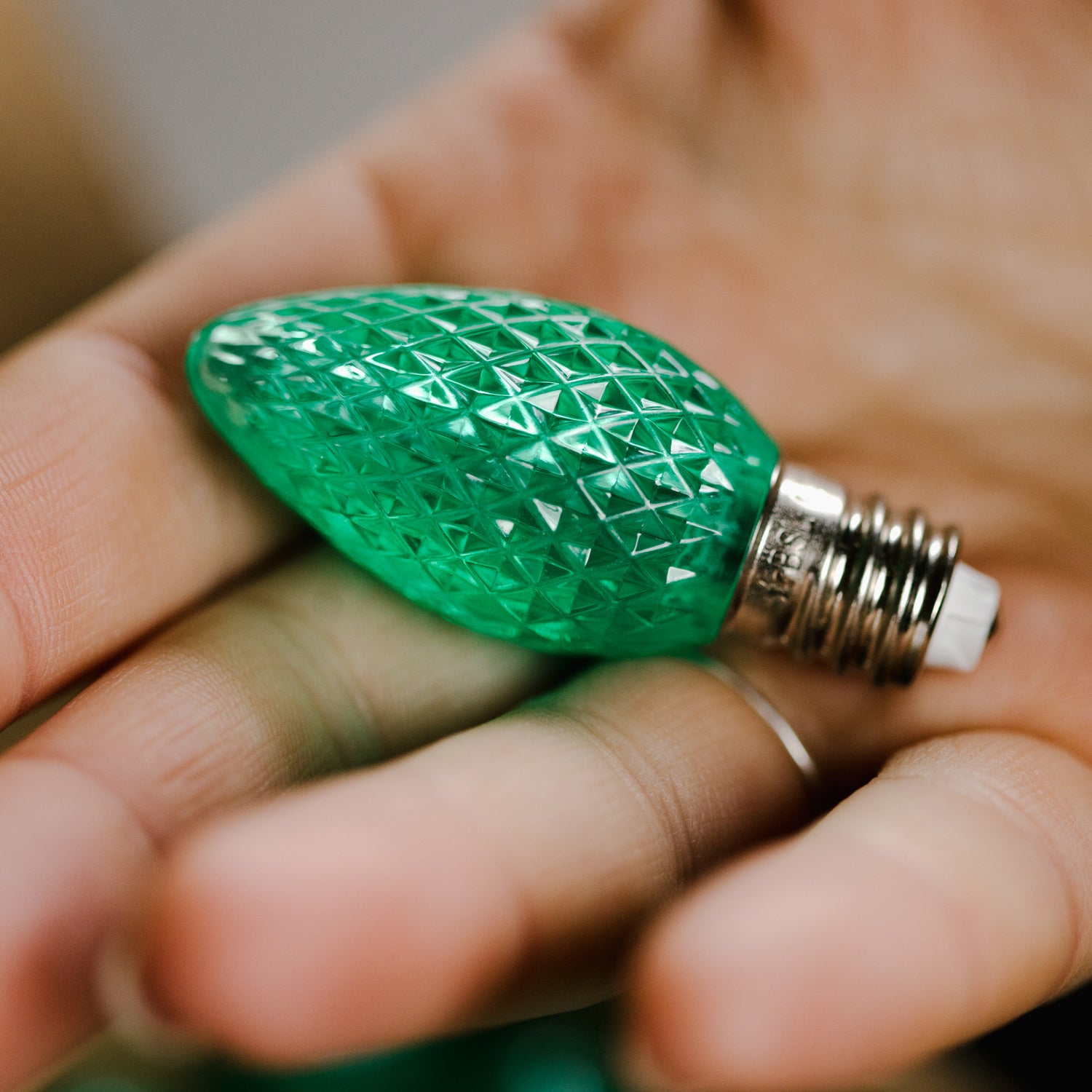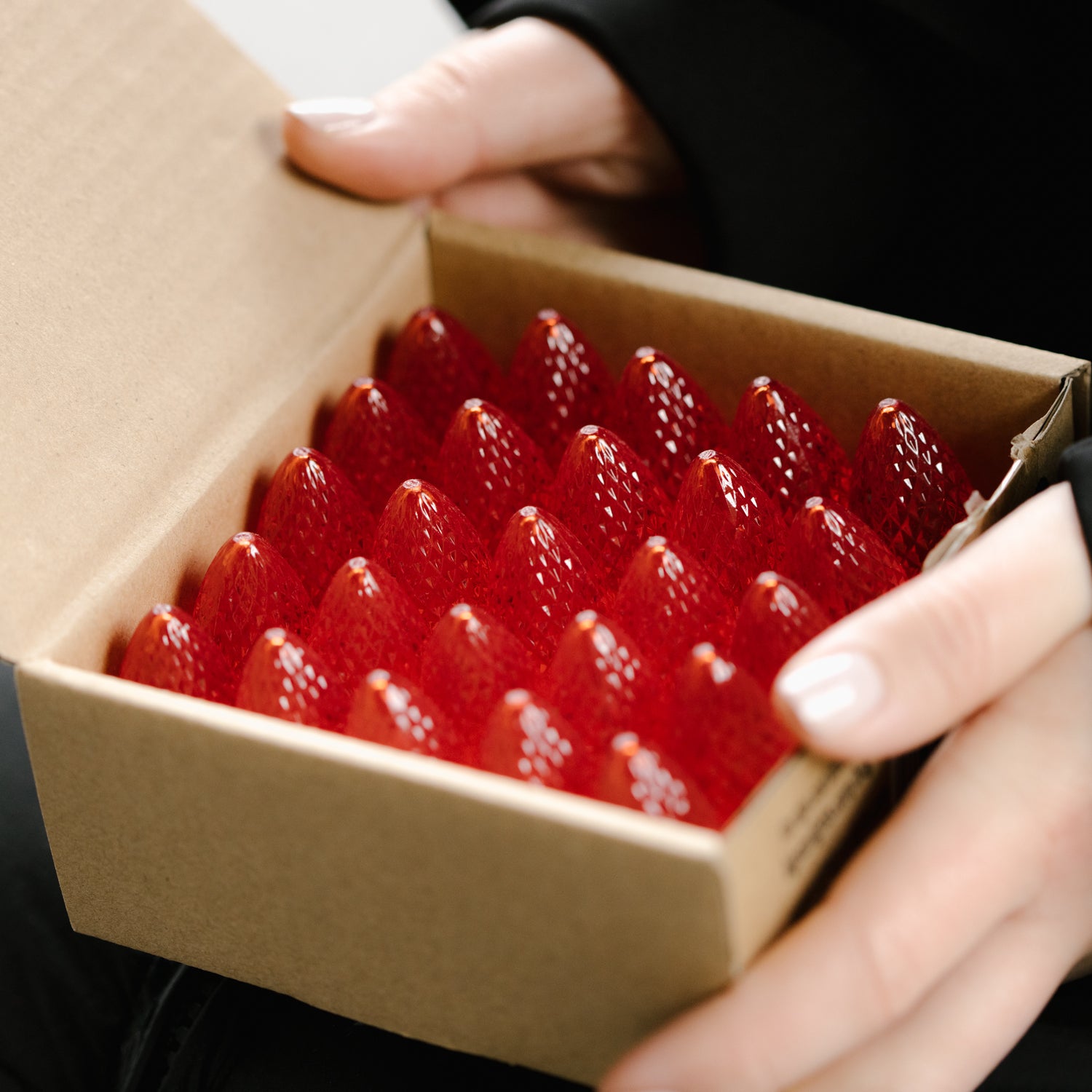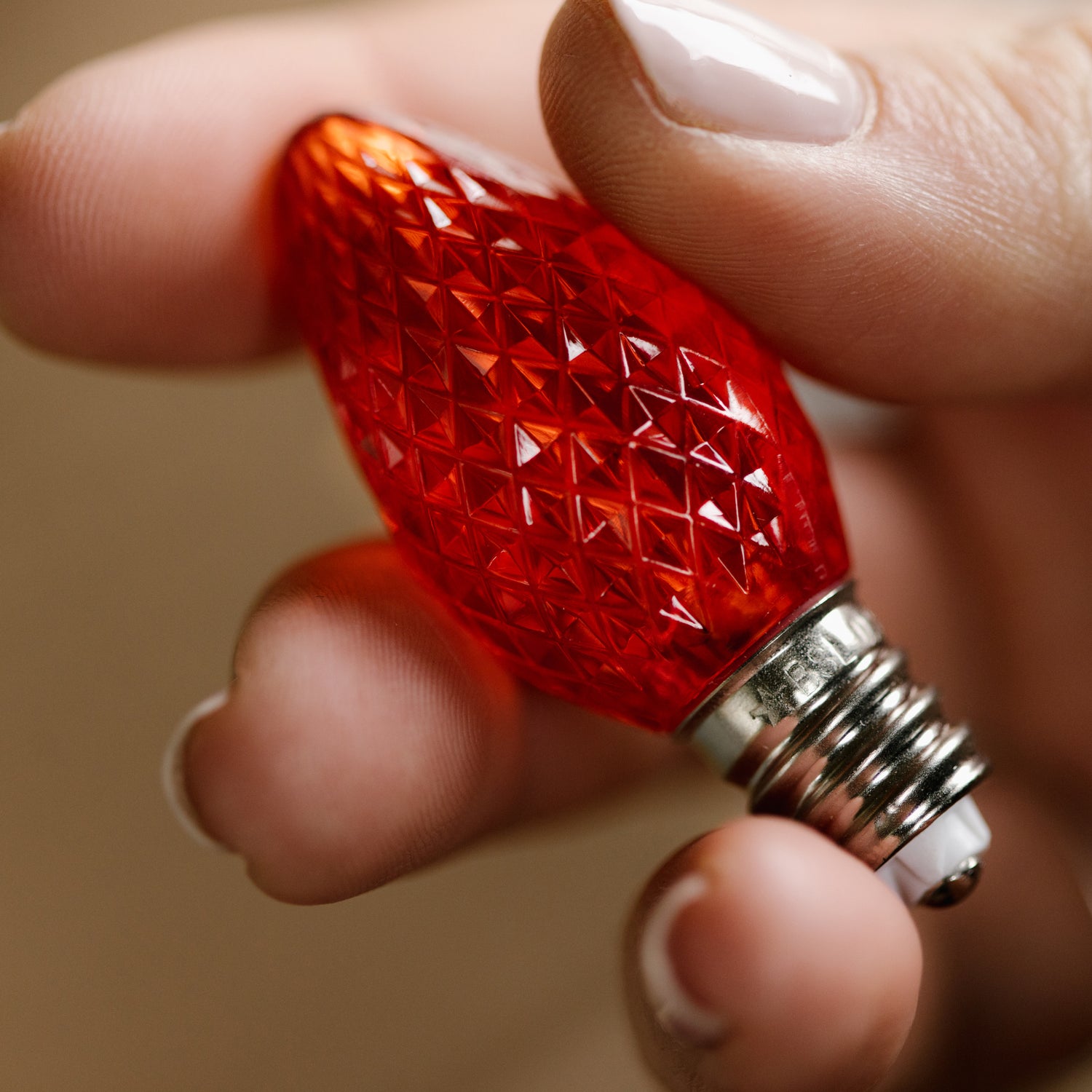 A traditional festive bulb, this strawberry-shaped C7 Features a faceted lens for sparkle and high visibility. Use them for lining windows, wrapping trees, or a more discrete roofline look! Pair them with E12 base socket wire. High quality components and modern LED chips mean these bulbs will shine brighter for longer, in any weather!