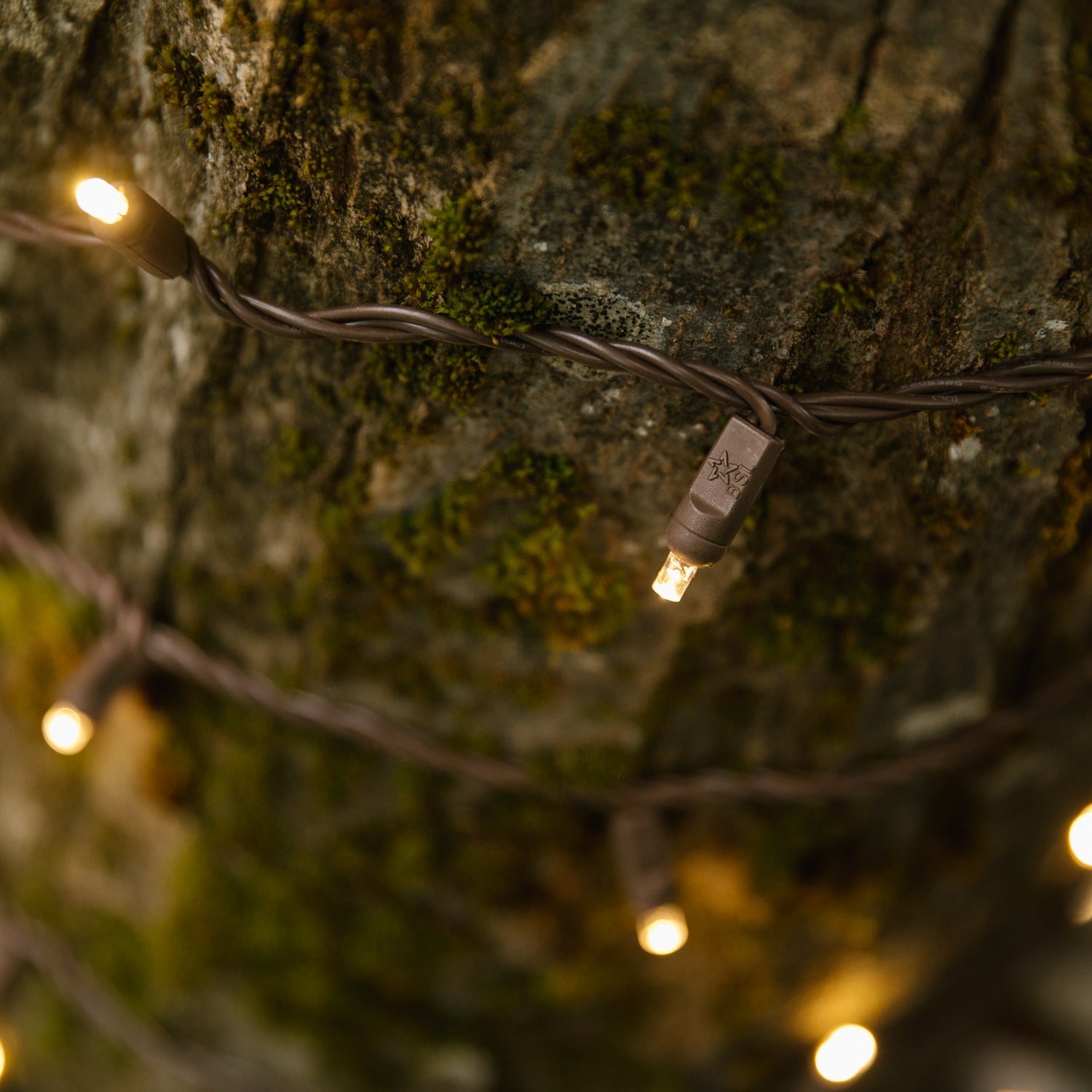 These Brown Wire Mini Lights will add a touch of magic to your outdoor space! Concealed during the day and vibrant at night, these lights seamlessly blend into bark and tree trunks. Each bulb offers 270-degree light dispersion, thanks to the cleverly designed inverted cone in the lens. With alternating 4 & 6 inch spacing, they create a densely lit display, without a 'line effect' when wrapping around a branch or trunk. Built to last, these lights feature durable and waterproof construction, capable of withstanding rain, snow, and cold temperatures. The coaxial connection system ensures a watertight connection with a rubber O-ring, eliminating corrosion issues. Seamlessly end-to-end connectable, you can create a display that shines without worrying about them pulling apart.