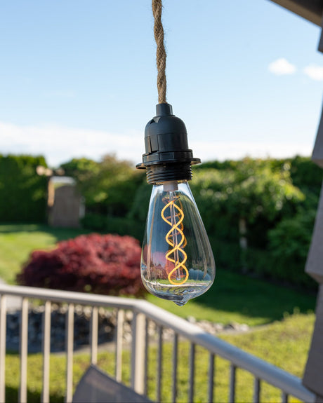 Eye-catching spiral LED filament, ideal for patios and weddings.