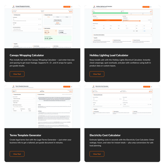 These aren’t fluff downloads or generic templates — they’re purpose-built tools made for lighting pros. Use them to quote faster, plan installs with precision, check circuit safety, generate legal terms, and calculate costs on the fly.