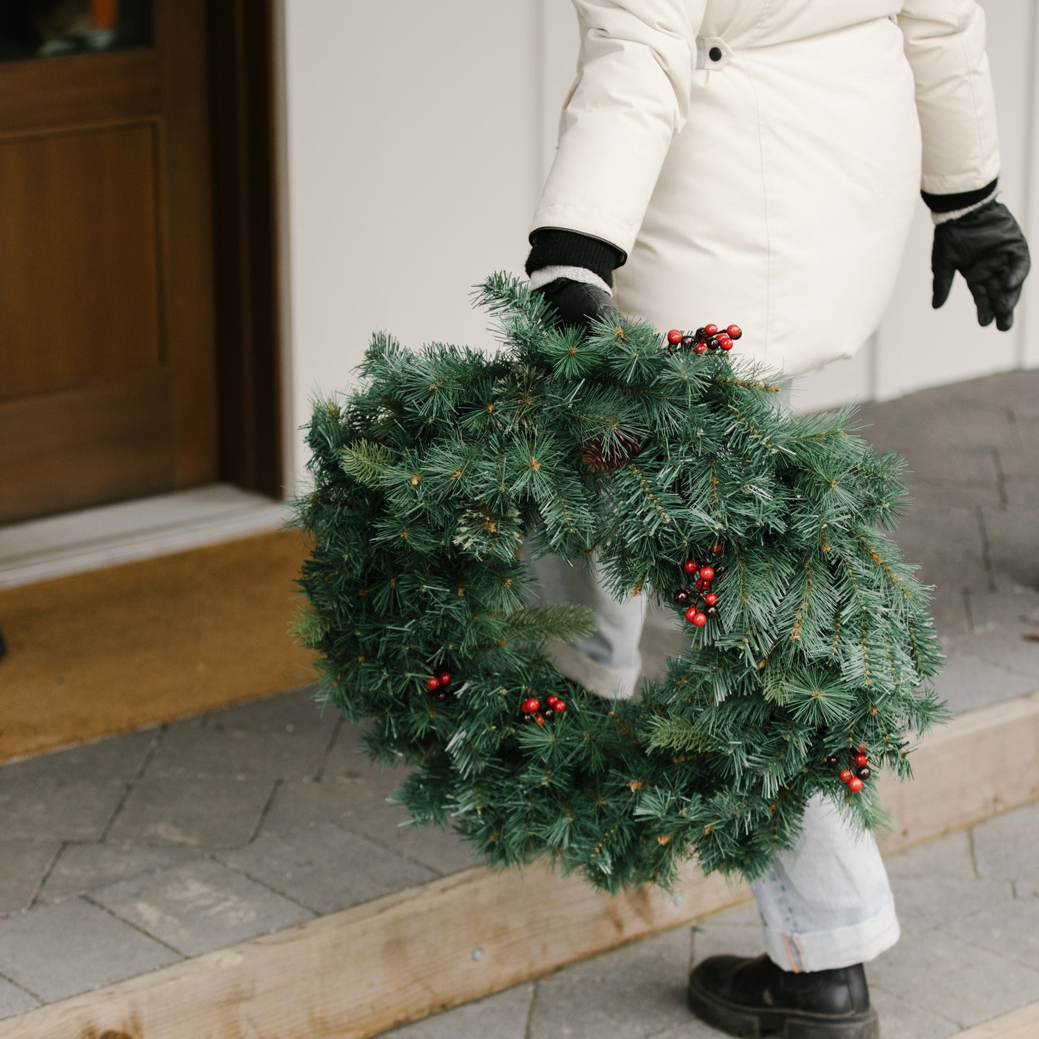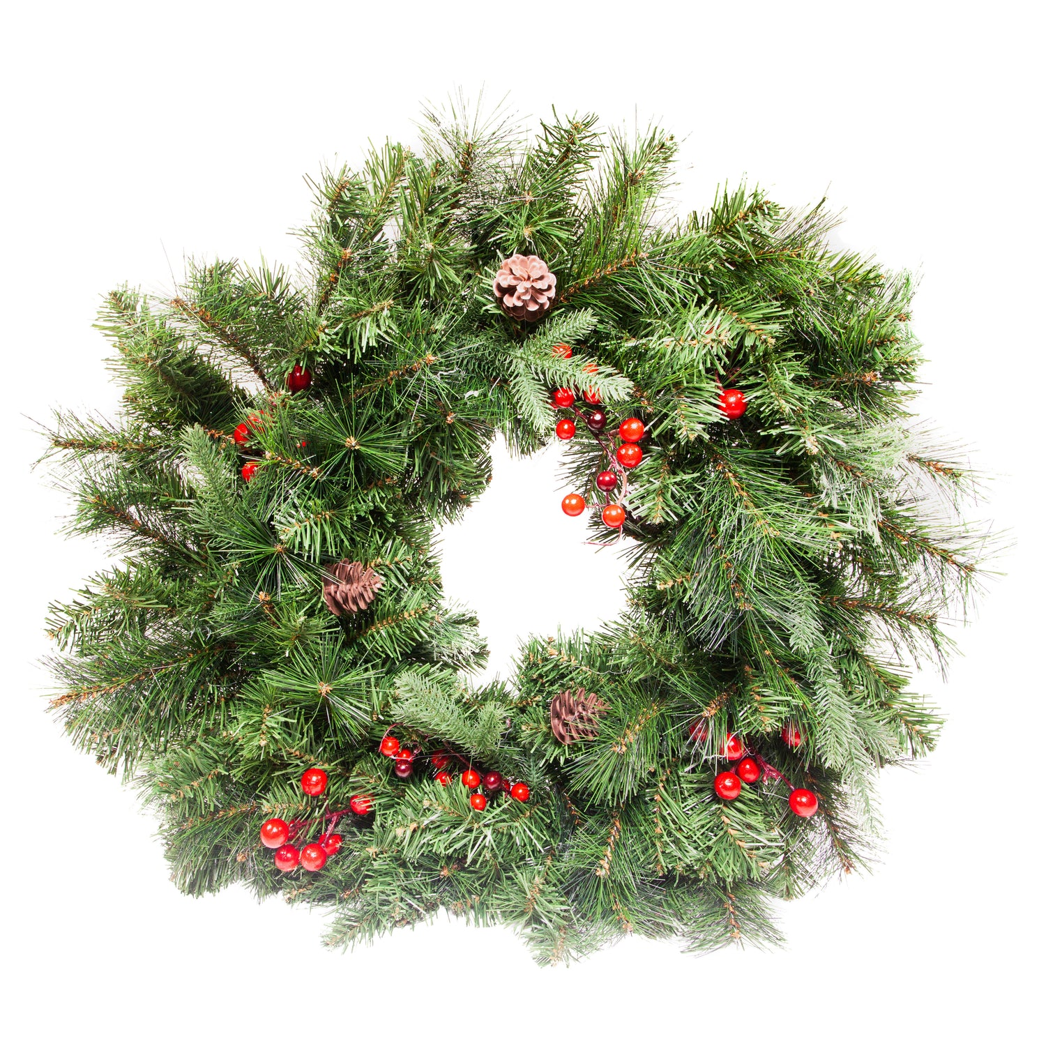 Generously embellished with berries and pine cones, this decor stands out. Three types of needles are used providing a very natural looking wreath. Bolts using 1/2 inch nuts connect the sections together providing a very secure and rigid round shape.