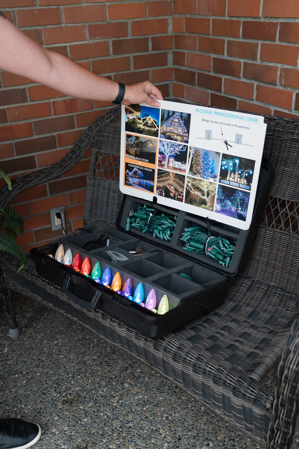 This sleek unbranded display case is designed for you to easily showcase our products to prospective clients. It includes all the products in our popular sample kit, photos on the inside, slots for a brochures & business cards, and a carrying handle for easy transportation. The Display Kit includes: String Lights:5mm Mini Lights, Green Wire - Warm White Twinkle5mm Mini Lights, Green Wire - Pure WhiteCoaxial Light String AdapterCoaxial Plug Extension CordLED Bulbs:G30 Bulb Colors: WW, PW, R, O, G, B, Y, P, T, F, LC9 Bulb Colors: WW, PW, R, O, G, B, Y, P, T, F, L Socket wire (22 sockets):12" section of E17 wire white12" section of E17 wire green12" section of E17 wire brown12" section of E17 wire black Dielectric Grease Filled SPT2 Plugs:Black - Male & FemaleClear - Male & Female Clips & Stakes:Ultimate Multi Clip - White & BlackMagnetic Clips - Black & ClearRidge ClipMagnetic Roof Cap ClipLawn StapleLawn Stake 5"