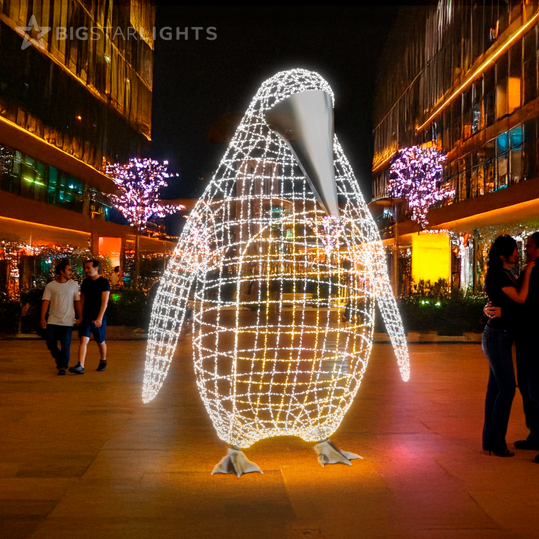 The penguin is a beloved sculpture symbolizing the playfulness of winter. This 12 foot tall bird uses a mix of pure-white and warm-white LEDs. The face and feet are polished aluminum, providing an elegant look to your holiday decor. Combine this with our iceberg sculptures for a truly magical experience that is particularly popular around skating rinks. Other sizes are available upon request. Clear beads are available for extra sparkle at an additional cost