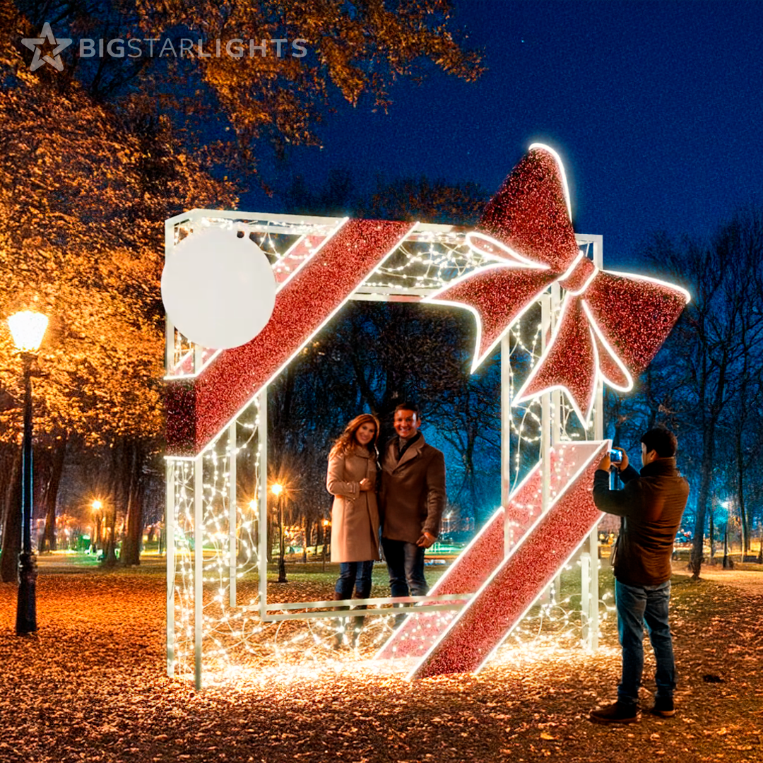 Gather the friends and family for a beautifully lit portrait that's fit to make it on the front of a Christmas card. A stylishly lit red 3D bow compliments the design (other bow colors available upon request). It's self-standing with large steel plates on the bottom that can be additionally anchored for strong winds. Various LED colors are available, although the most popular is warm-white with 15% of the lights twinkling in pure-white, combined with a red bow. An additional tag on the upper left corner is made of frosted acrylic can be used to display your business logo.